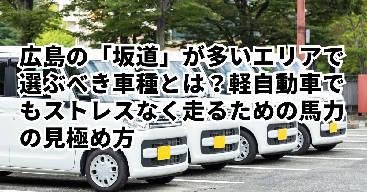 広島の「坂道」が多いエリアで選ぶべき車種とは?軽自動車でもストレスなく走るための馬力の見極め方はじめに 広島市にお住まい、あるいはビジネスで訪れる方にとって、切っても切れないのが「坂道」の問題です。安佐南区や安佐北区の新興住宅地、東区の山の手エリアなど、…