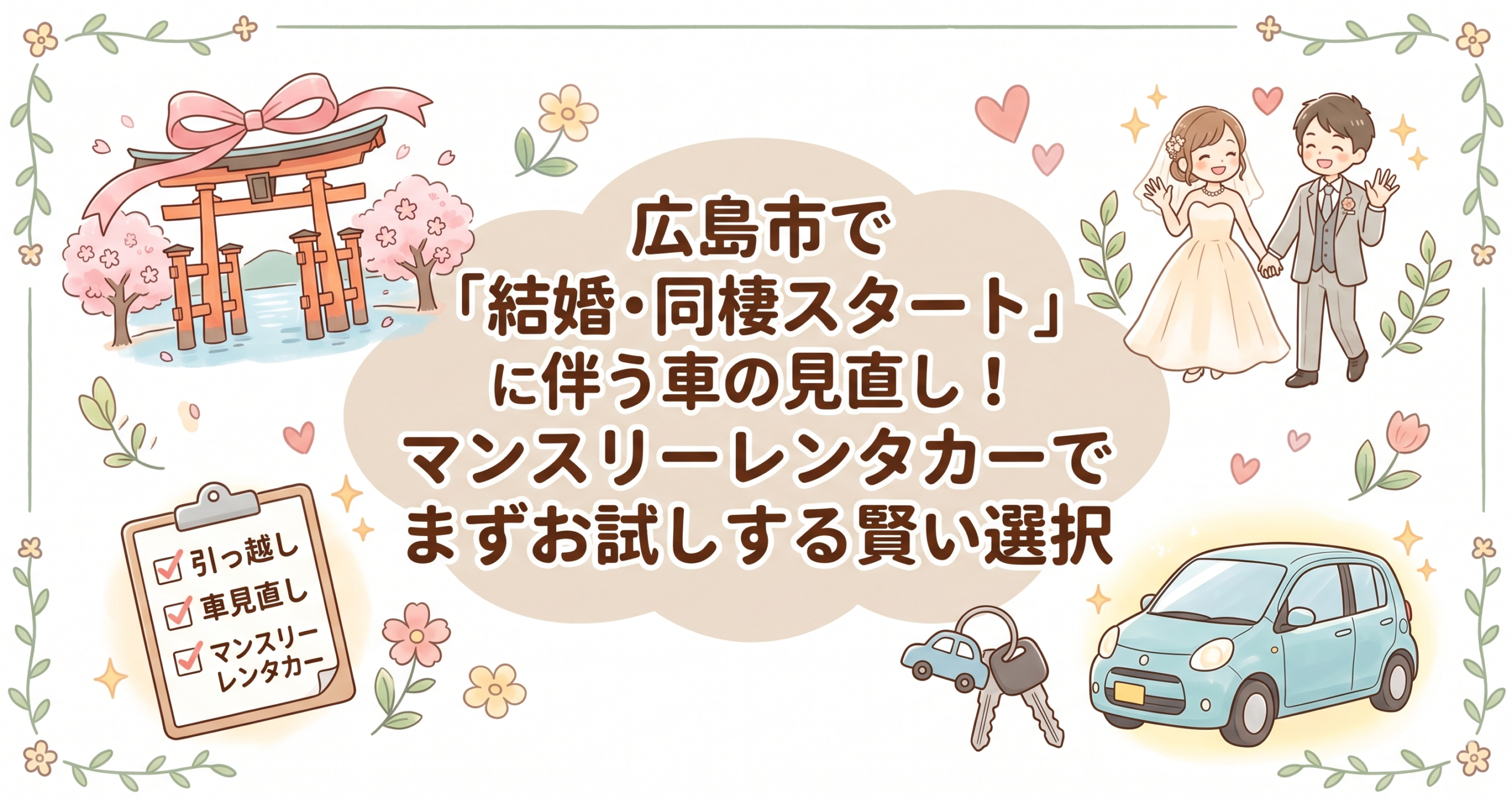 広島市で「結婚・同棲スタート」に伴う車の見直し!マンスリーレンタカーでまずお試しする賢い選択はじめに 結婚や同棲のスタートにあたって、「車を1台(または2台)どうするか」という問題は、意外と後回しにされがちです。引越し・家具・生活費など出費が集中する時…