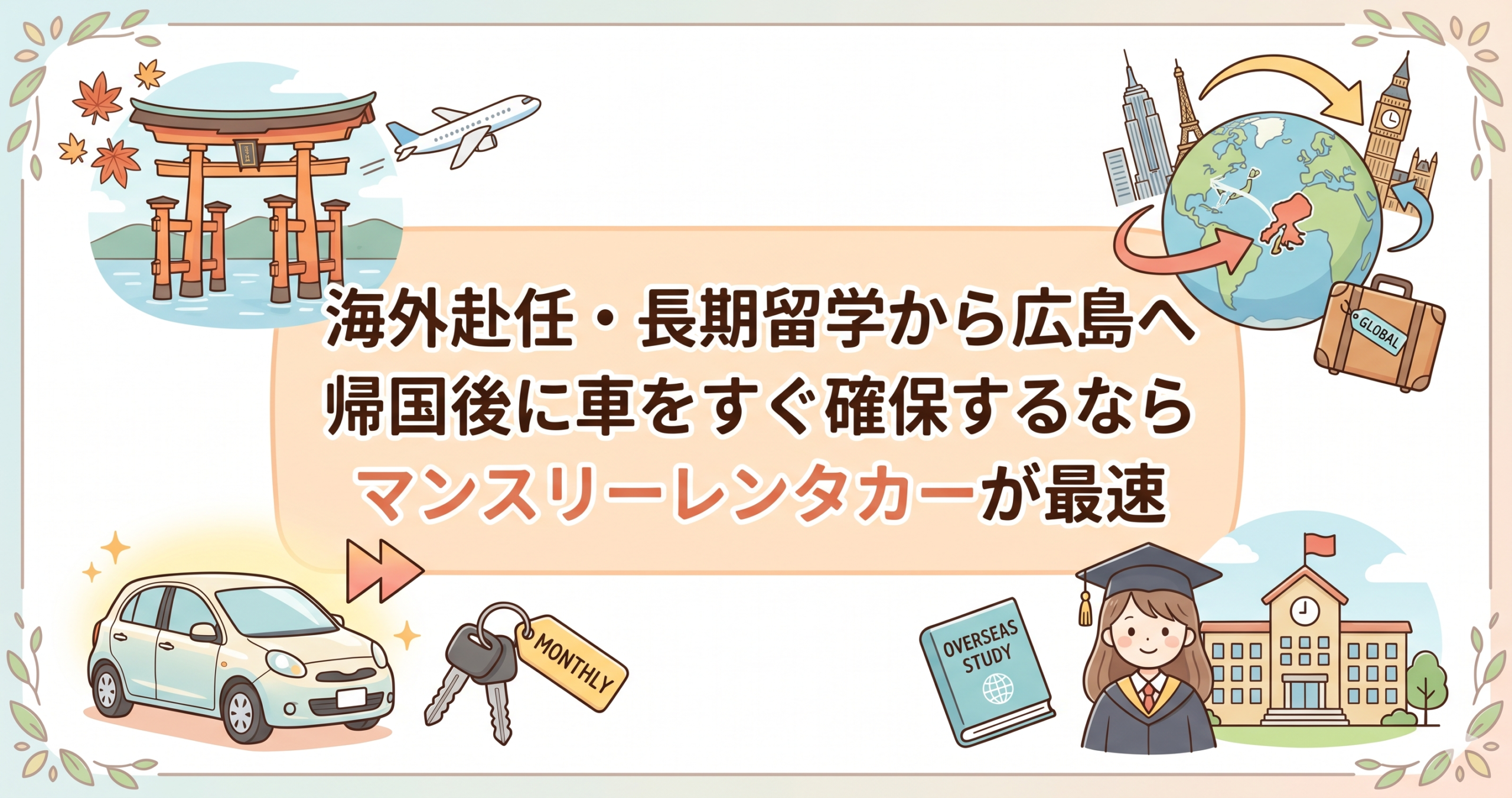 海外赴任・長期留学から広島へ帰国後に車をすぐ確保するならマンスリーレンタカーが最速はじめに 海外赴任や長期留学を終えて広島に帰国したとき、多くの方が「車がすぐ必要だけど、どうすればいい?」という問題に直面します。引越しの荷物整理・役所への各種…