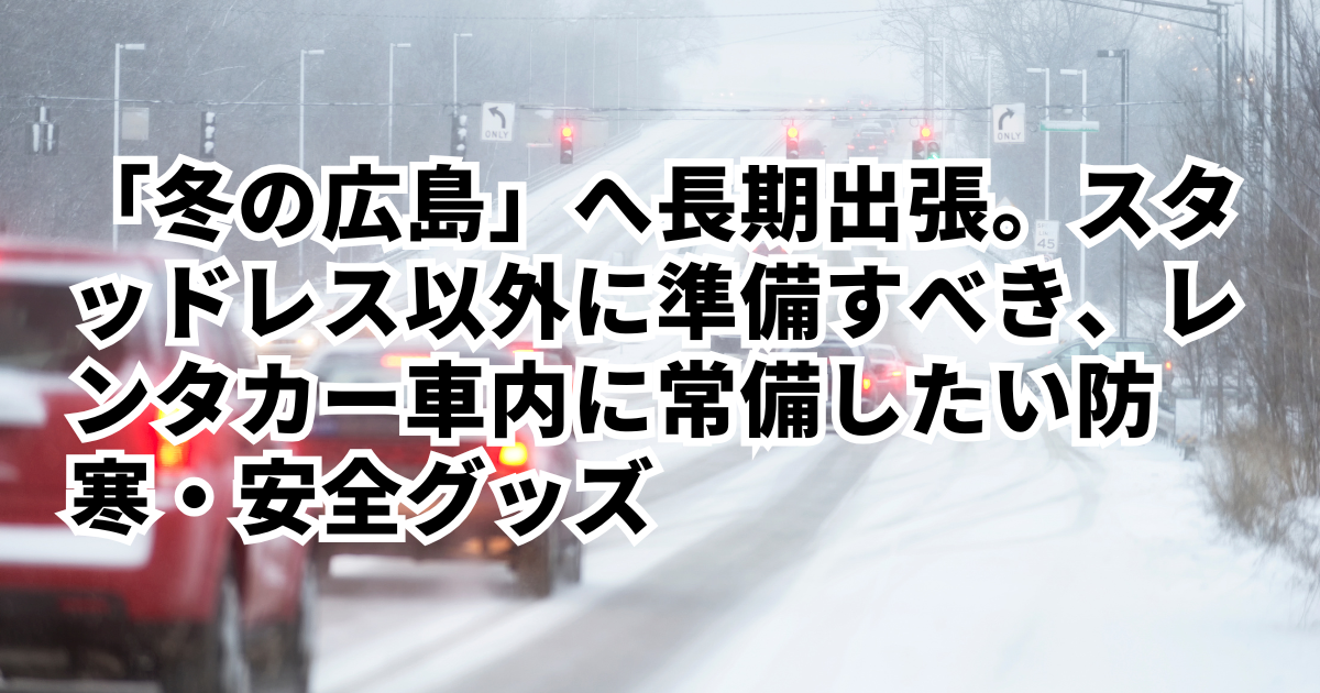 「冬の広島」へ長期出張。スタッドレス以外に準備すべき、レンタカー車内に常備したい防寒・安全グッズはじめに 冬の広島への長期出張、準備は万端ですか?広島市内は比較的温暖なイメージを持たれがちですが、北部の山間部や中国山地沿い、さらには沿岸部でも急な冷え込みに…