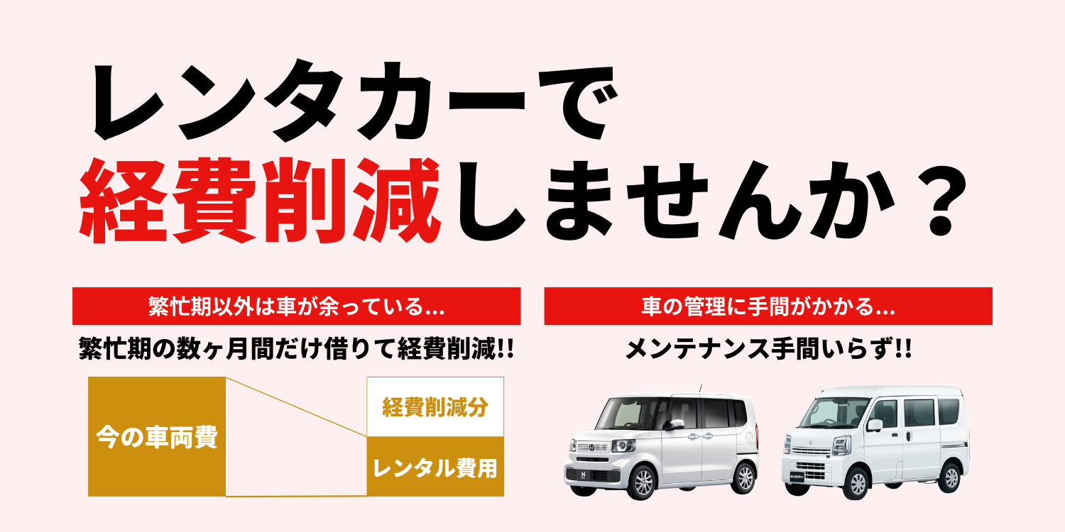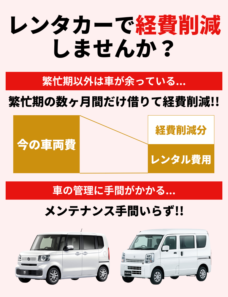 必要な期間、必要な台数のレンタカーを借りることでクルマを自社で所有するより経費の削減が可能です。所有したクルマはメンテナンス費用や保険費用、税金など様々な維持費を必要とします。レンタカーに切り替えることで、自動車に関連する経費をコントロールすることが可能になります。