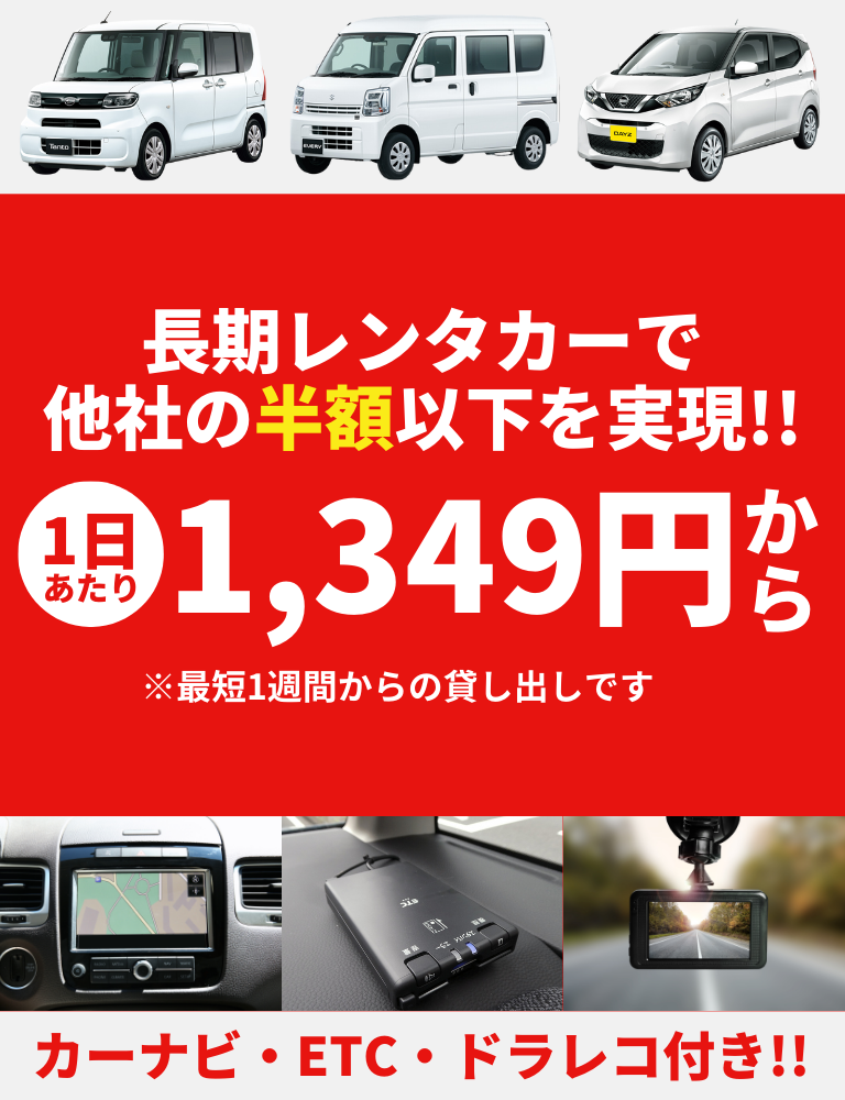 レンタカーには保険が含まれており、整備も弊社にて万全な体制となっています。自社で所有した場合の保険の加入漏れや加入条件の不足、車検などの整備漏れのリスクは一切ございません。事故や故障など万が一の緊急連絡も一本化されておりますので、安心してご利用いただけます。