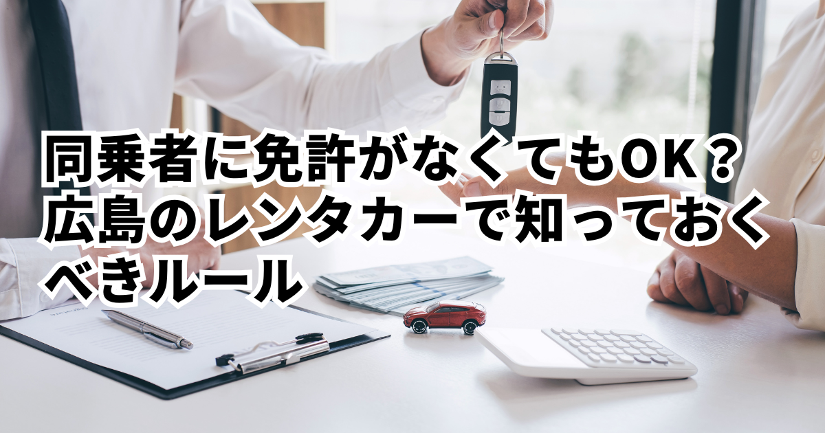 家族旅行や送迎、荷物の運搬など、同乗者と移動する場面ではレンタカーが便利です。運転するのは自分だけでも、同乗者に免許がない場合は問題があるのか気になる方が多いはずです。広島市でも同じ悩みを持つ利用者は多く、特に初心者や免許取り立ての方は不安が大きくなります。この記事では、同乗者が無免許でもレンタカーを借りられるのか、法律やレンタカー会社のルールを踏まえてわかりやすく解説します。