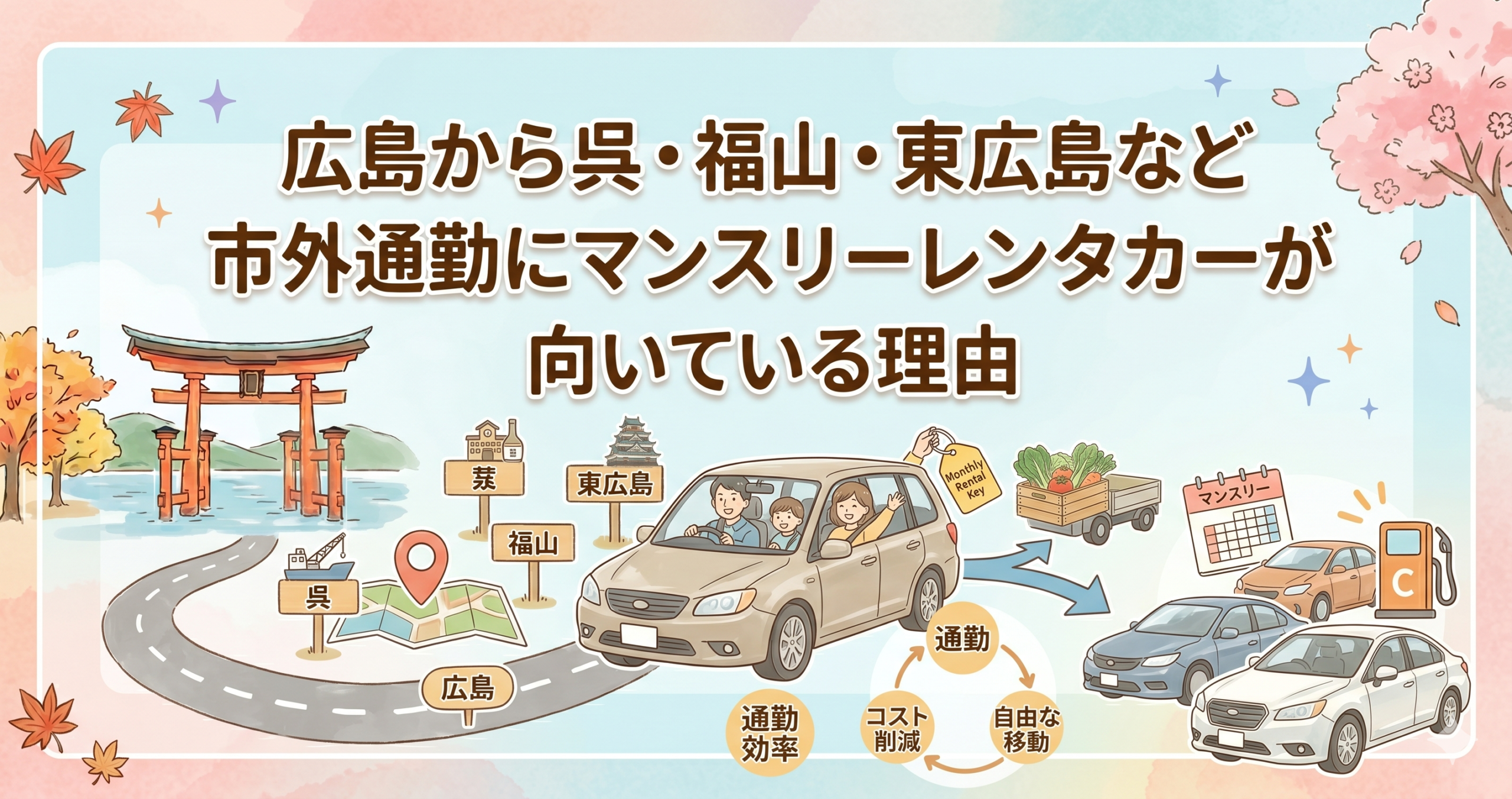 広島市内に住みながら、呉市・福山市・東広島市・廿日市市などの近隣都市に通勤しているという方も少なくありません。また逆に、近隣市に住みながら広島市内へ通勤するケースもあります。こうした「市外通勤」では、電車が走っていない時間帯のシフトや、駅から遠い職場への移動など、公共交通だけでは対応しきれない場面が多くあります。この記事では、広島市を中心とした近隣エリアへの市外通勤にマンスリーレンタカーが適している理由と、賢い活用方法を解説します。